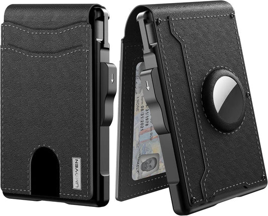 AirTag Wallet for Men - with Pop Up Aluminum Case Money Clip Slim Leather Slots Credit Card Holder RFID Blocking Bifold Minimalist Wallet