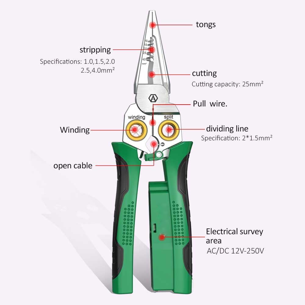 Multi-Functional 8-in-1 Design: This 8-in-1 cable cutter and stripper integrates multipleĀ tools, making it a versatile solution for various electrical operations.